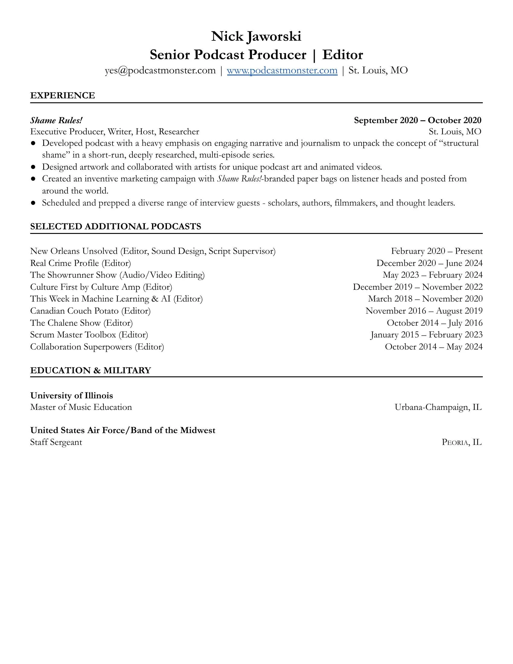 Experienced Podcast Producer & Editor with 10 years of crafting narrative-driven audio that captivates audiences. Having produced 3,000+ episodes with 60+ million downloads, Nick combines technical expertise with creative storytelling to deliver polished, memorable content that resonates with listeners. And, yes, he edits in Audition. 💪